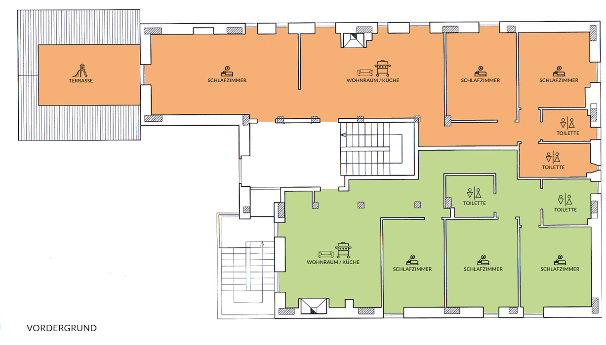 Die beiden Appartements können durch Öffnen einer sie trennenden Tür gemeinsam, oder bei geschlossen gehaltener Tür separat verwendet werden.