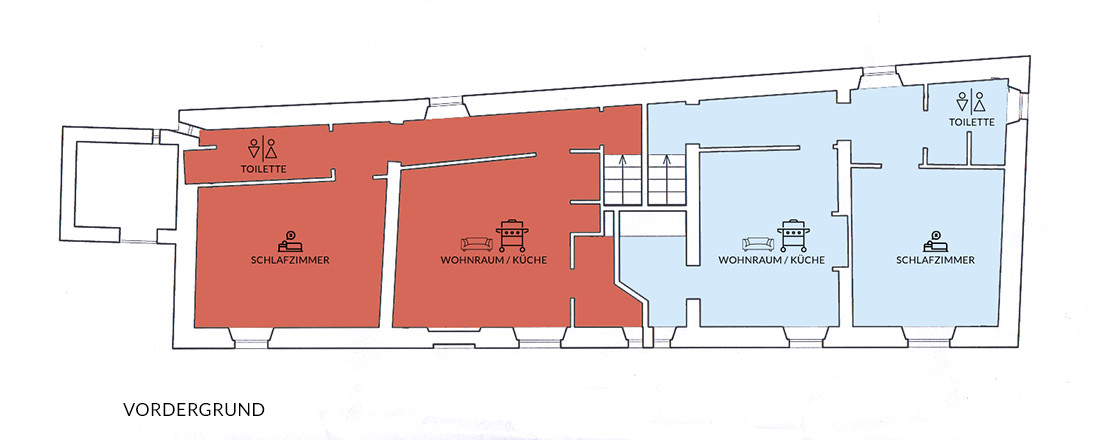 Appartement nr. 4 (1er étage): (3. Stock) befindet sich über dem Appartement Nr. 3 mit gemeinsamem Eingang: Kochnische, 2 Schlafzimmer mit 5 Betten, Bad; kann gemeinsam mit Appartement Nr. 3 benutzt werden; wenn separat verwendet, verfügt es nur über ein Schlafzimmer, das als Wohnzimmer mit einem Doppelbettsofa benutzt werden kann.