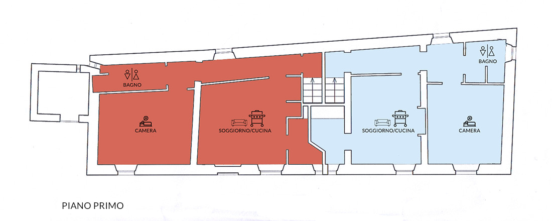 Appartamento n. 2 (piano I) posizionato sopra l’appartamento n. 1 con ingresso comune: angolo cottura, 2 camere con 4 posti letto, bagno, può essere vissuto in comune con l’appartamento n. 1; se vissuto separatamente, si riduce di una camera da adibire a soggiorno con divano letto doppio.